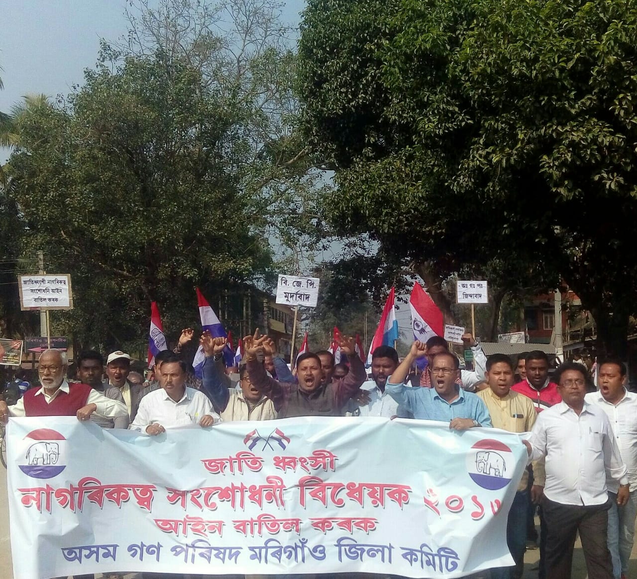 মৰিগাঁওঃ নাগৰিকত্ব সংশোধনী বিধেয়ক বাতিলৰ দাবীত বুধবাৰে উত্তাল হৈ পৰিল মৰিগাঁও নগৰ। মৰিগাঁও জিলা কৰ্মচাৰী পৰিষদে মৰিগাঁও বিহুতলীত ৩ ঘন্টীয়া অৱস্থান ধৰ্মঘটৰ কায্যসূচী ৰূপায়ণ কৰাৰ বিপৰীতে মৰিগাঁও জিলা অগপই উলিয়াই এক প্ৰতিবাদী সমদল। নাগৰিকত্ব সংশোধনী বিধেয়ক বাতিলৰ দাবীত দুই দল সংগঠনে চৰকাৰ বিৰোধী বিভিন্ন শ্ল’গান দি মৰিগাঁও নগৰ এক উত্তাল কৰি তুলে।