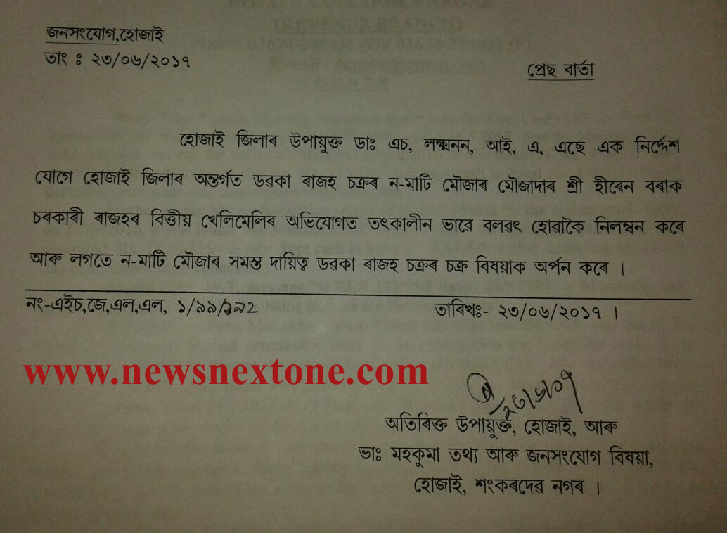 হোজাইঃ হোজাই জিলাৰ ডবকা ৰাজহ চক্ৰৰ অন্তৰ্গত ন’মাটী মৌজাৰ মৌজাদাৰক আজি মৌজাদাৰ পদৰ পৰা নিলম্বন কৰাত চাঞ্চল্যৰ সৃষ্টি হৈছে মৌজাটোত৷ হোজাইৰ উপায়ুক্তই এক নিৰ্দেশযোগে মৌজাদাৰৰ দায়িত্বৰ পৰা নিলম্বন কৰে মৌজাদাৰ হৰেন বৰাক৷