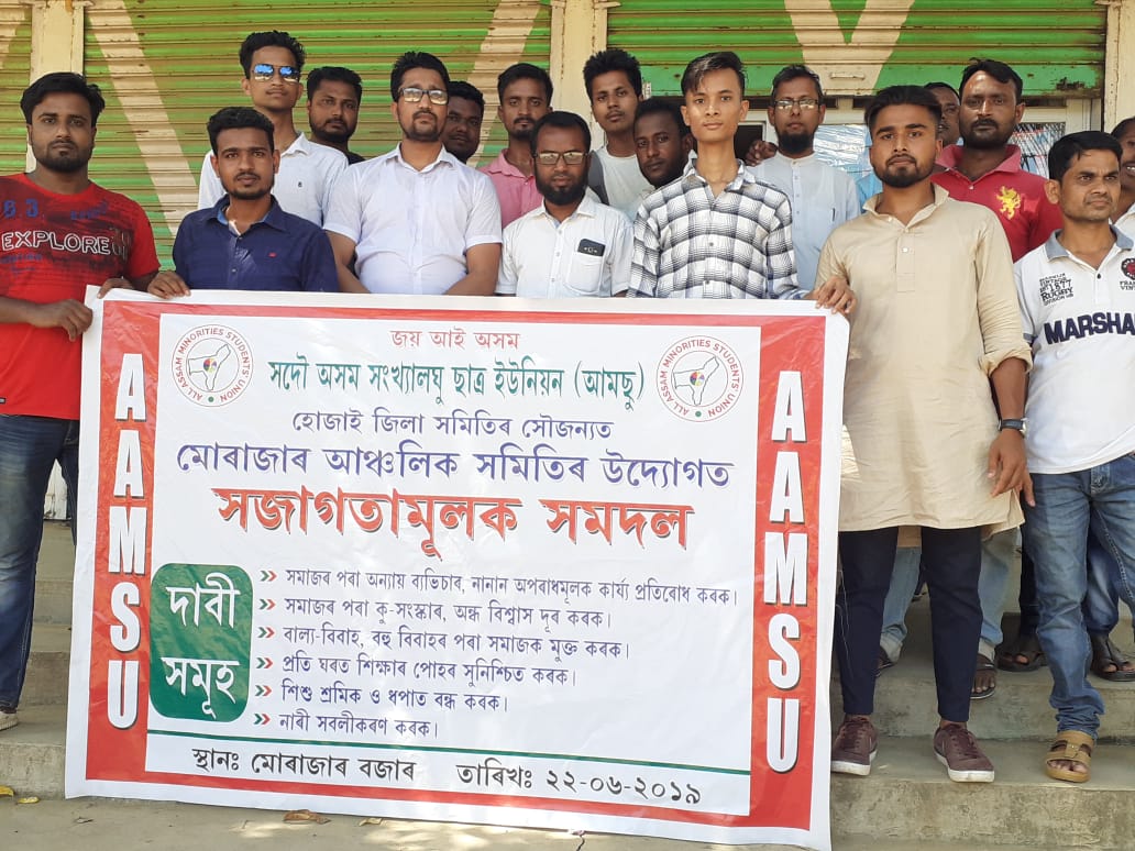 ছাদিকুজ জামান মোৰাঝাৰঃ সমাজৰপৰা অপৰাধমূলক কাৰ্য্য প্ৰতিৰোধ কৰা, অন্ধবিশ্বাস, কু-সংস্কাৰ দূৰ কৰা, প্ৰতি ঘৰত শিক্ষা সুনিশ্চিত কৰা, বাল্য বিবাহ, বহু বিবাহ বন্ধ কৰা, জনসংখ্যা বৃদ্ধি নিয়ন্ত্ৰণ কৰা, দুটিতকৈ বেছি সন্তান জন্ম দিয়া বন্ধ কৰা, নাৰী সবলীকৰণ কৰা আদি বিষয়ত ৰাইজক সজাগতা সৃষ্টি কৰাৰ্থে সমগ্ৰ অসমৰ লগতে হোজাই জিলা আমছুৰ উদ্যোগত মোৰাঝাৰ আঞ্চলিক আমছুৰ সহযোগত আজি দিনৰ ১২ বজাত মোৰাঝাৰ বজাৰত এখনি সজাগতা সমদল উলিওৱা হয়৷