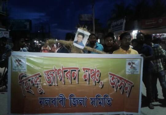 জুবিন গাৰ্গৰ মন্তব্যৰ বিৰুদ্ধে হিন্দু জাগৰণ মঞ্চ আৰু ৰুদ্ৰ সেনা অসম নামৰ দুই ভাতৃ সংগঠনে সোমবাৰে নলবাৰী চহৰৰ হৰিমন্দিৰ চ’কত জুবিন গাৰ্গ মুৰ্দাবাদ ধ্বনি দি জুবিন গাৰ্গৰ প্ৰতিমূৰ্তি দাহ কৰে।