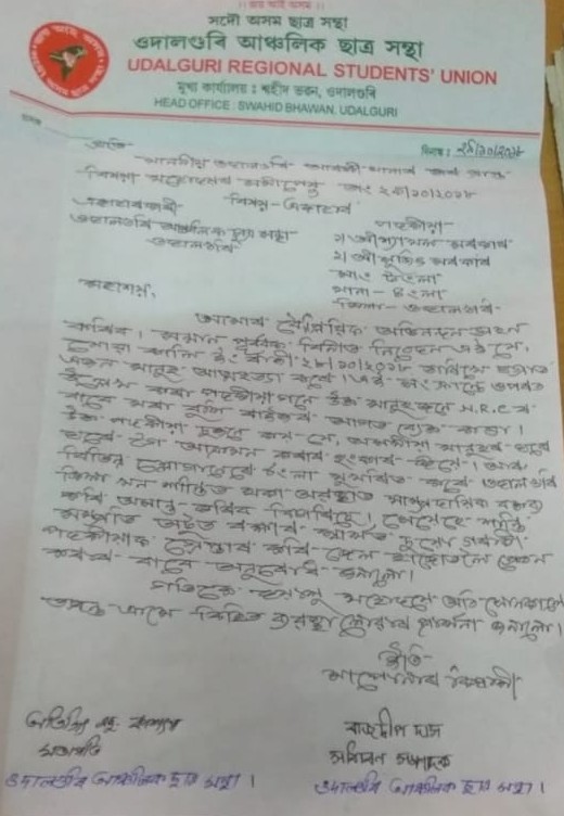ওদালগুৰিঃ কালি ওদালগুৰি জিলাৰ হৰিশিঙা আৰক্ষী থানাৰ অন্তৰ্গত ঘাগ্ৰা-উলুবাৰী গাঁৱত সংঘটিত কাৰ্যৰ বিৰুদ্ধে আজি জাঙুৰ খাই উঠে সদৌ অসম ছাত্ৰ সন্থা, চমুকৈ আছুৰ ওদালগুৰি আঞ্চলিক সমিতি। উল্লেখযোগ্য যে শনিবাৰে এন আৰ চি কৰ্তৃপক্ষৰপৰা ডি ভোটাৰৰ জাননী লাভ কৰি উক্ত গাঁৱৰ দীপক দেৱনাথ (৪৯) নামৰ লোকজনে নিজৰ গৃহ চৌহদত থকা এজোপা গছত চিপজৰী লৈ আত্মহত্যা কৰে। লগে লগে অঞ্চলটোত সৃষ্টি হয় উত্তপ্ত পৰিস্থিতিৰ। লোকজনৰ মৃত্যুৰ খবৰ পাই ঘটনাস্থলীত উপস্থিত হয় বিটিচি বেংগলী যুৱ ছাত্ৰ ফেডাৰেশ্বনৰ মূখ্য উপদেষ্টা শ্যামল সৰকাৰ, সভাপতি সুজিৎ সৰকাৰৰ লগতে এটা সজাতি দল। ইয়াৰ পাছত একাংশ ৰাইজৰ সহযোগত সংগঠনটোৱে দীপক দেৱনাথৰ মৃতদেহ লৈ উলুবাৰী-ঘাগ্ৰা পথ অৱৰোধ কৰে। উক্ত কাৰ্যসূচীৰ মাজত সুজিৎ সৰকাৰে সংবাদ মাধ্যমৰ আগত আলোচনাপন্থী আলফা নেতাক উদ্দেশ্য কৰি মন্তব্য প্ৰকাশ কৰিছিল যে ‘আপোনালোকৰ হাতত যেনেকৈ এতিয়া অস্ত্ৰ আছে, আমাৰ গাতো এতিয়া শক্তি আছে। আমাৰ গাত সুভাষ বসু, খুদিৰাম বসুৰ দৰে লোকৰ তেজ আছে। আমিও মানুহ মাৰিব জানো। আমিও চাই লম।’ ইমানতে ক্ষান্ত নাথাকি তেওঁ কয় যে ‘দৰকাৰ হ’লে আমি আপোনালোকৰ ঘৰত সোমাই গৈ মাৰিম। বিগত দিনৰ ইতিহাস আমি পাহৰি গৈছোঁ, আমিও নতুন ইতিহাস ৰচনা কৰিম’ বুলি একপ্ৰকাৰ অসমীয়া জাতিক ভাবুকি প্ৰদান কৰিছিল। নেতাজনৰ উক্ত সাম্প্ৰদায়িক মন্তব্যৰ পাছতে আজি জাঙুৰ খাই উঠিছে আছুৰ ওদালগুৰি আঞ্চলিক সমিতি। সংগঠনটোৱে আজি দুয়োজন নেতাৰ বিৰুদ্ধে ওদালগুৰি আৰক্ষী থানাত এজাহাৰ দাখিল কৰে। আঞ্চলিক ছাত্ৰ সন্থাৰ সভাপতি-সম্পাদক ক্ৰমে অভিজিৎ এছ কাশ্যপ আৰু ৰাজদ্বীপ দাস স্বাক্ষৰিত আছুৰ পেডত লিখা এজাহাৰখনত সংগঠনটোৱে উল্লেখ কৰি কয় যে এনে ধৰণৰ মন্তব্যই সাম্প্ৰদায়িক সংঘৰ্ষৰ উচতনি যোগাব। এনে মন্তব্যই সমাজত বিষবাষ্প যোগোৱাত উদগনি যোগাব। গতিকে এনে ঘটনা সংঘটিত হোৱাৰ পূৰ্বেই বিটিচি বেংগলী যুৱ ছাত্ৰ ফেডাৰেশ্বনৰ মূখ্য উপদেষ্টা শ্যামল সৰকাৰ, সভাপতি সুজিৎ সৰকাৰক গ্ৰেপ্তাৰ কৰি আৰক্ষীয়ে তদন্ত আৰম্ভ কৰাৰ লগতে জে’ল হাজোতলৈ প্ৰেৰণ কৰিব লাগে। লগতে অনাগত দিনত সকলো পক্ষকে এনে ধৰণৰ মন্তব্য কৰাৰপৰা বিৰত থাকিবলৈ সংগঠনটোৱে সকীয়নি প্ৰদান কৰে।