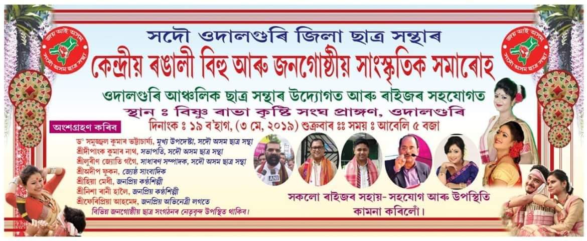 অঞ্জনজ্যোতি শৰ্মা, ওদালগুৰিঃ বতৰৰ বিধি পথালি তথা ওদালগুৰি চহৰত নেৰানেপেৰাকৈ অব্যাহত থকা বৰষুণৰ ফলত ওদালগুৰি আঞ্চলিক ছাত্ৰ সন্থাৰ উদ্যোগত আৰু ওদালগুৰিৱাসী ৰাইজৰ সহযোগত  অহা ৩ মে’ শুক্ৰবাৰে অনুষ্ঠিত হবলগীয়া পঞ্চম বাৰ্ষিক সদৌ ওদালগুৰি জিলা ছাত্ৰ সন্থাৰ কেন্দ্ৰীয় ৰঙালী বিহু আৰু জনগোষ্ঠীয় সাংস্কৃতিক সমাৰোহখনিৰ দিন সলনি কৰিবলৈ বাধ্য হৈছে।