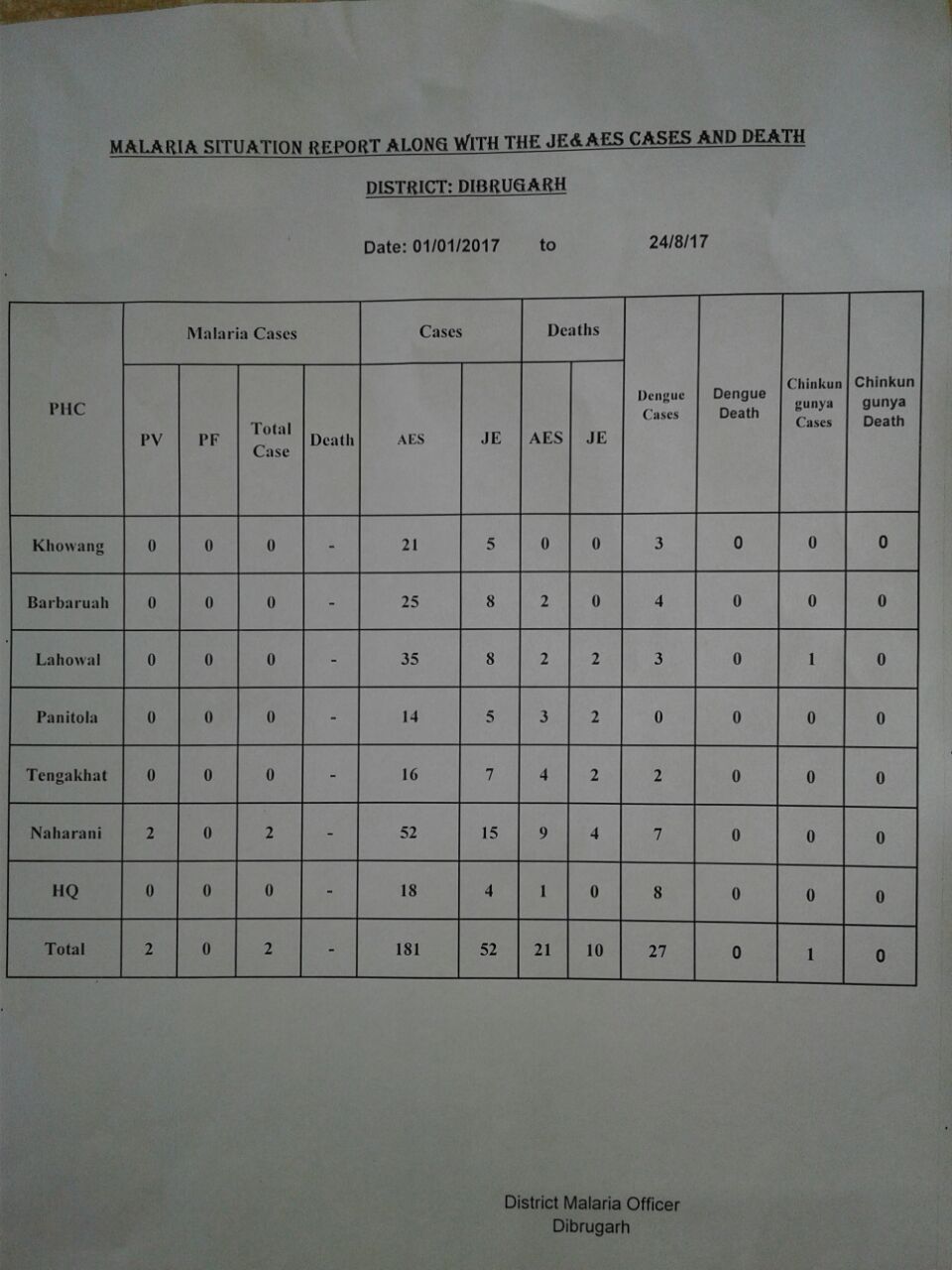 ডিব্ৰুগড় জিলা যুটীয়া স্বাস্থ্য সঞ্চালকৰ কাৰ্য্যলয়ৰ পৰা লাভ কৰা তথ্যতে পোহৰলৈ আহিছে জাপানীজ এনকেফেলাইটিছ ৰোগৰ সংহাৰ ছবি। প্ৰাপ্ত তথ্য অনুসৰি জিলাখনত এই পৰ্য্যন্ত উক্ত দুই ৰোগত কেইবাটিও শিশুসহ ৩১ গৰাকী লোকে প্ৰাণ হেৰুৱাইছে।