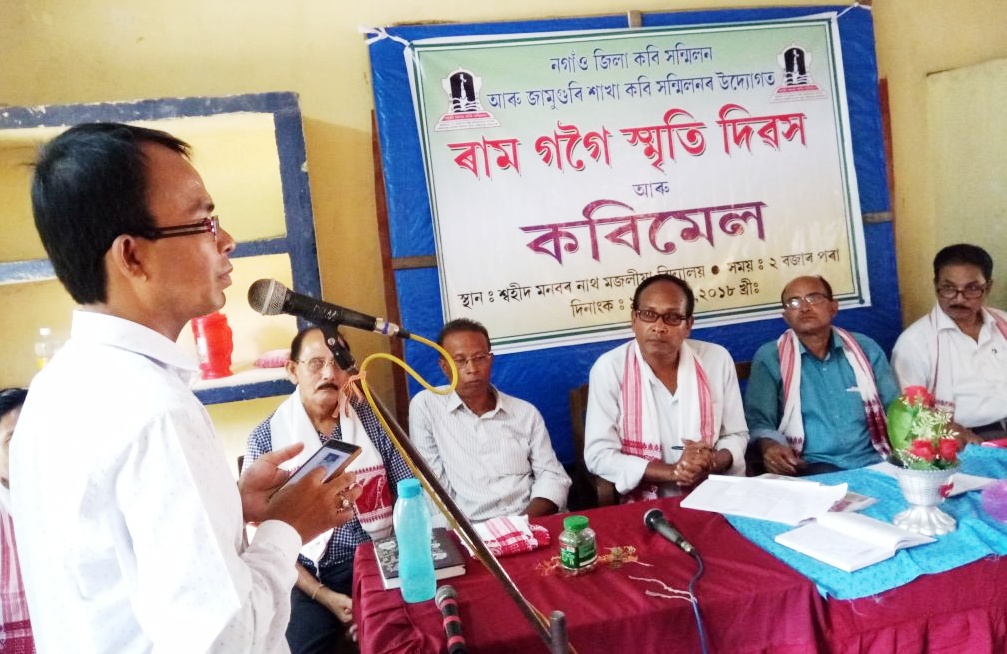 তদনুযায়ী পূৰ্ব বছৰ বোৰৰ দৰেই আজি নগাঁও জিলা কবি সন্মিলন আৰু জামুগুৰি শাখা কবি সন্মিলনৰ যুটীয়া উদ্যোগত এই দিৱসটি বেবেজীয়াৰ সমীপস্থ জামুগুৰিৰ শ্বহীদ মনবৰ নাথ মজলীয়া বিদ্যালয়ত অনুষ্ঠিত কৰা হয়। কাৰ্যসূচী অনুসৰি, বিয়লি ৩ বজাত জামুগুৰি শাখা কবি সন্মিলনৰ সভাপতি কৰৱী লিগিৰা আৰু কাৰ্যকৰী সভাপতি অনিল চন্দ্ৰ নাথে ৰাম গগৈৰ প্ৰতিচ্ছৱিত বন্তি প্ৰজ্বলন কৰাৰ অন্তত শিল্পী পেন্সনাৰ পৰাণ দাসৰ পৰিচালনাত তথা জগন্নাথ দাস আৰু বিষ্ণুপ্ৰিয়া দাসৰ সহযোগত গীতাঞ্জলি দাসৰ দ্বাৰা পৰিবেশিত এটি বৰগীতেৰে মূল অনুষ্ঠান স্মৃতিচাৰণ সভা আৰু কবিমেলৰ শুভাৰম্ভ কৰা হয়।