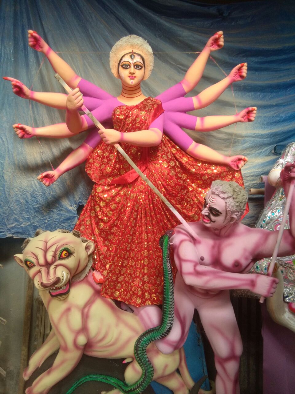 দুৰ্গা প্ৰতিমাত শেষ পৰশ দিয়াত ৰত খনিকৰ সকল। এই পৰ্যন্ত তেজপুৰৰ মৃন্ময় শিল্পী সকলে প্ৰতিমা নিৰ্মাণৰ কাম প্ৰায় ৯০ শতাংশ সম্পূৰ্ণ কৰি তুলিছে। উল্লেখ্য যে, তেজপুৰ চহৰৰ লগতে ডেকাৰগাও, মিলনপুৰ, ডিপোটা, বালিপুখুৰি তিনিআলি, বিহগুৰকেধৰি প্ৰায় ১২৫খন দুৰ্গা পূজা অনুষ্ঠিত হ’ব৷