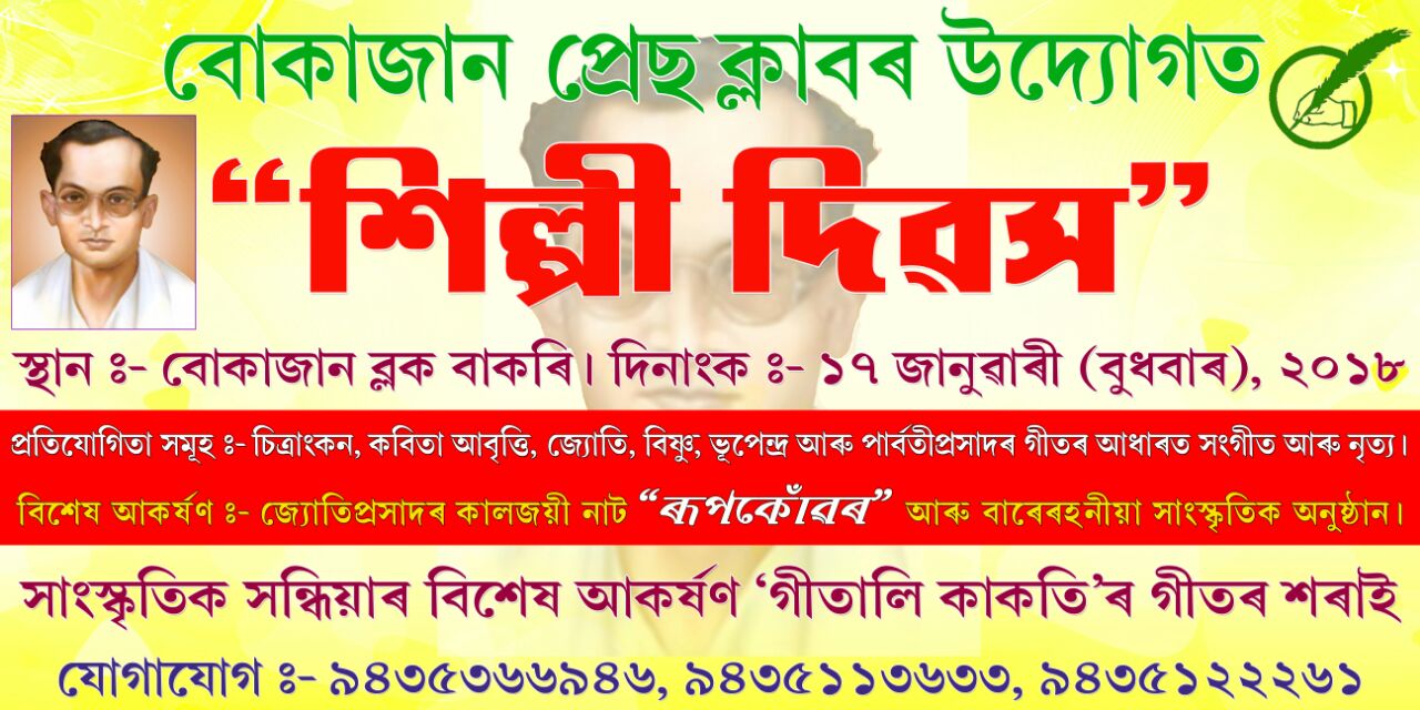 বোকাজানঃ অহা ১৭ জানুৱাৰীত ৰূপকোঁৱৰ জ্যোতিপ্ৰসাদ আগৰৱালাৰ স্মৃতি দিৱস পালন কৰাৰ বাবে ব্যাপক প্ৰস্তুতি চলিছে কাৰ্বি আংলং জিলাৰ বোকাজানত৷ পাহাৰীয়া জিলা কাৰ্বি আংলংৰ অন্যতম সাংবাদিক সন্থা বোকাজান প্ৰেছ ক্লাৱৰ উদ্যোগত বোকাজান ব্ল’ক বাকৰিত ১৭ জানুৱাৰীত দিনজোৰা বৰ্ণিল কাৰ্যসূচীৰে শিল্পী দিৱস পালন কৰিব বুলি জানিব পৰা গৈছে৷