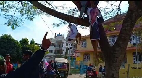 নাগৰিকত্ব সংশোধনী বিধেয়কৰ সপক্ষে RSS এ সভা অনুষ্ঠিত কৰা ঠাইতে আছুৰ এই উত্তাল প্ৰতিবাদ। গান্ধী মণ্ডপৰ সন্মুখৰ কৃষ্ণচুড়া গছত আৰক্ষীৰ সন্মুখতে মুখ্যমন্ত্ৰী আৰু প্ৰধানমন্ত্ৰীৰ প্ৰতিমূৰ্তিক ফাঁচী দিলে আছুয়ে।