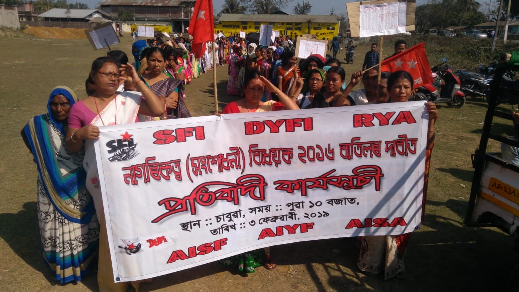 ডিব্ৰুগড়ঃ চাবুৱাৰ ৩৭ নং ৰাষ্ট্ৰীয় ঘাইপথত ভাৰতৰ ছাত্ৰ ফেডাৰেচন, ভাৰতৰ গণতান্ত্ৰিক ফেডাৰেচন, বিপ্লৱী যুৱ সংস্থা, নিখিল ভাৰত ছাত্ৰ ফেডাৰেচন, নিখিল ভাৰত যুৱ ফেডাৰেচন আৰু সদৌ ভাৰত ছাত্ৰ সংস্থাৰ উদ্যোগত আজি নাগৰিকত্ব (সংশোধনী) বিধেয়ক ২০১৬ বাতিলৰ দাবীত সহস্ৰাধিক লোকে প্ৰতিবাদ কাৰ্যসূচী ৰূপায়ন কৰে।