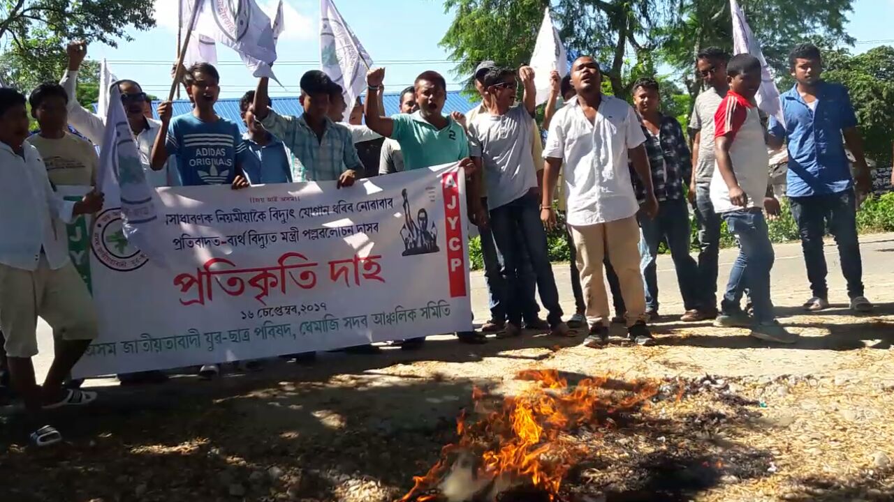 চিচিবৰগাঁওঃ যোৱা দুদিন ধৰি ধেমাজিত বিদ্যুৎৰ যোগান বন্ধ হৈ পৰাৰ প্ৰতিবাদত আজি অসম জাতীয়তাবাদী যুৱ ছাত্ৰ পৰিষদ ধেমাজি সদৰ আঞ্চলিক সমিতিয়ে ধেমাজিৰ বিদ্যুৎ বিভাগৰ কাৰ্যালয়ৰ সন্মুখত অসম চৰকাৰৰ শক্তি মন্ত্ৰী পল্লৱ লোচন দাসৰ প্ৰতিমূৰ্ত্তি দাহ কৰি পৰিবেশ উত্তাল কৰি তোলে।