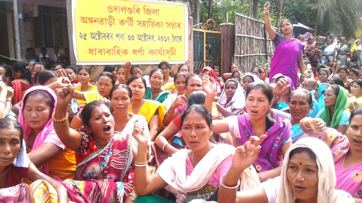 ওদালগুৰিঃ কেন্দ্ৰ-ৰাজ্য চৰকাৰৰ বিৰুদ্ধে প্ৰতিবাদ অব্যাহত ৰাখিছে অংগনবাড়ী কৰ্মী-সহায়িকাই৷ বাৰে বাৰে চৰকাৰে প্ৰতাৰণাৰ কৰাৰ অভিোগ উত্থাপন কৰি শুকুৰবাৰে ওদালগুৰি ধৰ্ণাত বহিল কৰ্মী-সহায়িকাসকল।