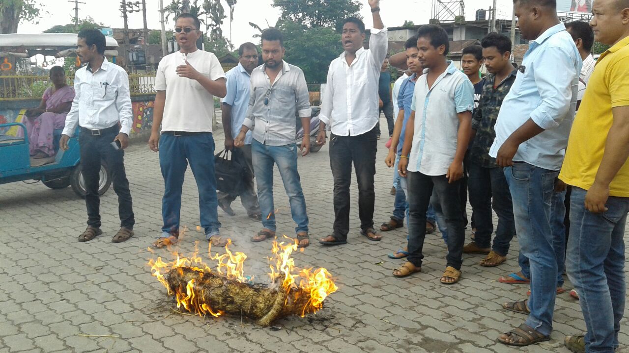 লখিমপুৰঃ লখিমপুৰত টাই-আহোম যুৱ ছাত্ৰ পৰিষদৰ পৰ্তিবাদ। মুখ্যমন্ত্ৰী সৰ্বানন্দ সোণোৱালে পলমকৈ বানপীড়িত অঞ্চল পৰ্যবেক্ষণ কৰিব অহাত ক্ষোভিত হৈ টাই আহোম যুৱ পৰিষদে মুখ্যমন্ত্ৰীৰ প্ৰতিকৃতি দাহ কৰে৷