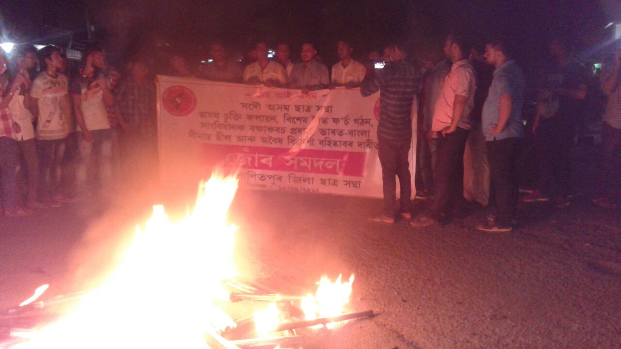 তেজপুৰ টাউনঃ তেজপুৰ আঞ্চলিক ছাত্ৰ সন্থাই আহ্বান কৰা এমহীয়া কাৰ্যসূচীৰ অংশ হিচাপে আজি তেজপুৰত জোঁৰ সমদল কাৰ্যসূচী ৰূপায়ণ কৰা হয়৷ হিন্দু-বংলাদেশী পুণৰ সংস্থাপনৰ বিৰোধীতা, অসম চুক্তি ৰূপায়ন, সাংবিধানিক ৰক্ষা কবচ প্ৰদান, অবৈধ্য বাংলাদেশী বহিঃস্কাৰ, বানপানীক ৰাষ্ট্ৰীয় সমস্যা হিচাপে ঘোষণা কৰা আদিৰ দাবীত ছাত্ৰ সন্থাই জোঁৰ সমদল উলিয়ায়৷