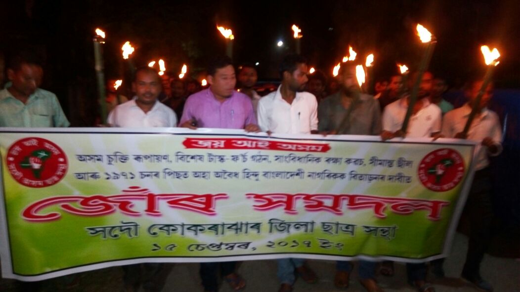 কোকৰাঝাৰঃ ১৯৭১ চনৰ পিছত অহা হিন্দু বাংলাদেশীক অসমত সংস্থাপনৰ প্ৰস্তুতি চলোৱা কাৰ্যৰ বিৰুদ্ধে আজি সদৌ কোকৰাঝাৰ জিলা ছাত্ৰ সন্থাই কোকৰাঝাৰ চহৰত জোৰ লৈ সমদল উলিয়ায়৷ আজি সন্ধিয়া ৬-৩০ বজাত কোকৰাঝাৰ চহৰৰ ৰাসমেলা পথাৰৰ পৰা উলিওৱা জোৰ সমদলটোৱে চহৰৰ মুখ্য পথেদি সমদল কৰি অসম চুক্তি ৰূপায়ন কৰক, অতি শীঘ্ৰে বিশেষ টাস্ক ফৰ্চ গঠন কৰক, অসম অবৈধ চৰণীয়া পথাৰ নহয়, কেন্দ্ৰীয়-ৰাজ্য চৰকাৰ হায় হায়, ধৰ্মৰ নামত বিদেশীক ভাগ ভাগ কৰা নচলিব আদি শ্ল’গান দি উত্তাল কৰি তোলে৷