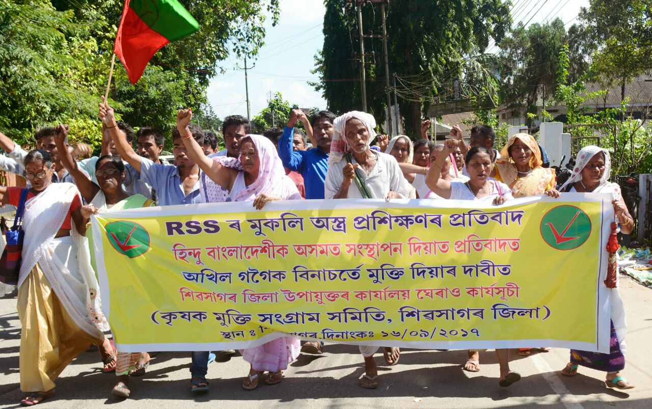 প্ৰতিবাদকাৰীসকলে শিৱসাগৰ ৰেল ষ্টেচনৰ পৰা সমদল উলিয়াই পাছত জিলা উপায়ুক্ত কাৰ্যালয় ঘেৰাও কৰে। বিজেপি মুৰ্দাবাদ, আৰ এছ এছ মুৰ্দাবাদ, আৰ এছ এছৰ অস্ত্ৰ প্ৰশিক্ষণ বন্ধ হ’ব লাগিবই, অখিল গগৈক বিনাচৰ্তে মুক্তি দিয়ক, সৰ্বানন্দ সোণোৱাল মুৰ্দাবাদ আদি বিভিন্ন চৰকাৰ বিৰোধী শ্ল’গানেৰে শিৱসাগৰ নগৰৰ আকাশ বতাহ উত্তাল কৰি তোলে৷