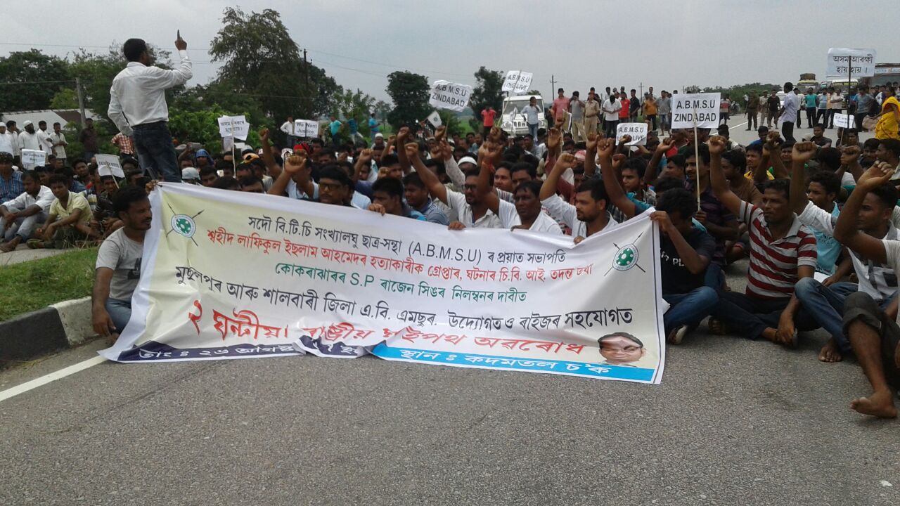 নলবাৰীঃ ছাত্ৰনেতা লাফিকুল ইছলাম আহমেদৰ হত্যাকাণ্ডৰ ঘটনাক লৈ আজি পৰ্যন্ত অব্যাহত আছে তীব্ৰ প্ৰতিবাদ আৰু ধৰ্না। হত্যাকাৰী গ্ৰেপ্তাৰত ব্যৰ্থ হোৱা অসম আৰক্ষী প্ৰশাসনৰ বিৰুদ্ধে আজি নলবাৰী-বাক্সা জিলা এবিএমছুৰ শতাধিক কৰ্মীয়ে কদমতল চ’কৰ ৩১ নং ৰাষ্ট্ৰীয় ঘাইপথ অৱৰোধ কৰি উত্তাল প্ৰতিবাদ সাব্যস্ত কৰে।