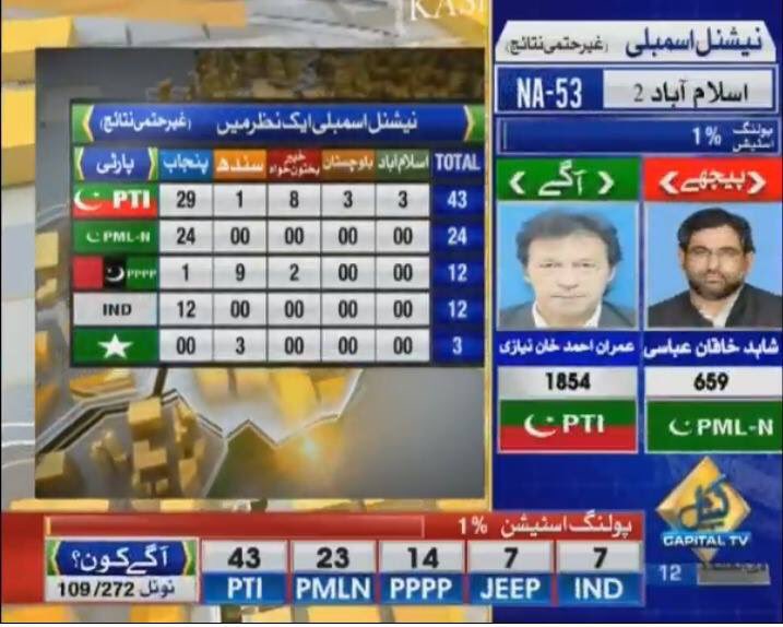 newsnextone.com | ডিজিটেল ডেস্কঃ বুধবাৰে পাকিস্তানৰ সাধাৰণ নিৰ্বাচনৰ ভোটদান সন্ধিয়া ৬ বজাত সমাপ্ত হয়। ৬ বজাত ভোটদান সমাপ্ত হোৱাৰ পিছতে প্ৰায় ১ ঘণ্টা পলমকৈ ভোটগণনা আৰম্ভ হয়। শেহতীয়া খবৰ মতে, প্ৰাক্তন ক্ৰিকেটাৰ ইমৰাণ খানৰ দল পাকিস্তান তেহৰিক-ই-ইন্সাফে ১২ খন আসনত আগবাঢ়ি আছে। আনহাতে পিএমএল দলে ৫ খন আসনত আগবাঢ়ি আছে বুলি আহিছে।
