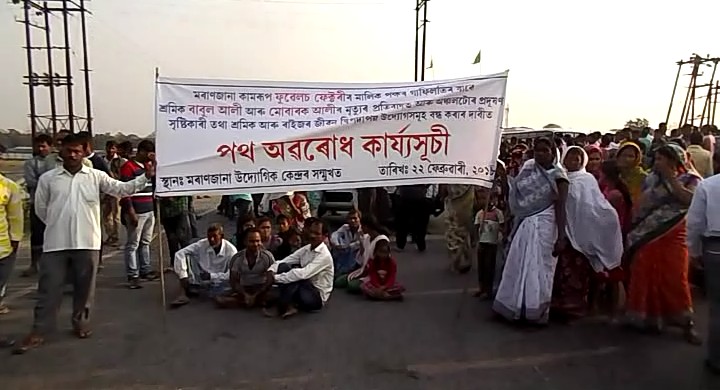 ৰঙিয়াঃ বৃহস্পতিবাৰে কামৰূপৰ ৰঙিয়াৰ মৰাণজানাত ৰাইজে পথ অৱৰোধ কৰি উত্তাল প্ৰতিবাদ সাব্যস্ত কৰে৷ কেইবাশতাধিক পুৰুষ মহিলাই প্ৰশাসন তথা এটি টায়াৰ কোম্পানীৰ গৰাকীৰ বিৰুদ্ধে শ্ল’গান দি উত্তাল পৰিৱেশৰ সৃষ্টি কৰে৷ যোৱা ১৫ ফেব্ৰুৱাৰীত মৰাণজানাৰ এটি টায়াৰ কোম্পানীত শ্ৰমিকে কাম কৰি থকা অৱস্থাতে মেচিন বিস্ফোৰণ সংঘটিত হৈ দুগৰাকী লোকৰ আহত হোৱাত চিকিৎসালয়ত ভৰ্তি কৰিছিল যদিও কেইটামান ঘন্টাৰ পিছতেই দুয়োগৰাকী শ্ৰমিকৰ মৃত্যু হৈছিল৷