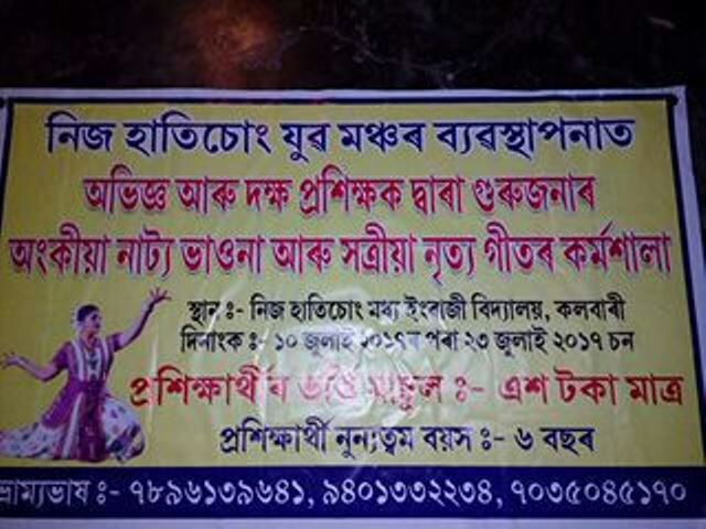 ১০-২৩ জুলাইলৈ এই কৰ্মশালাটি স্থানীয় কলবাৰীৰ নিজ হাতীচোং মধ্য ইংৰাজী বিদ্যালয়ত অনুষ্ঠিত হ’ব৷ ৰাজ্যৰ বহুকেইগৰাকী সুদক্ষ আৰু অভিজ্ঞতা সম্পন্ন প্ৰশিক্ষকৰ দ্বাৰা প্ৰশিক্ষণ প্ৰদান কৰিবলগীয়া উক্ত কৰ্মশালাত ৬ বছৰ উৰ্ধ্বৰ বয়সৰ সকলো স্তৰৰ লোকেই অংশগ্ৰহণ কৰিব পাৰিব৷
