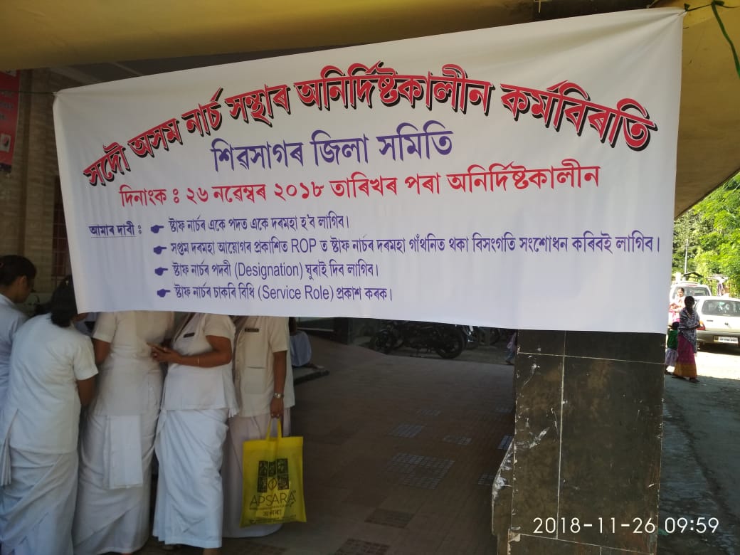 শিৱসাগৰ শাখাৰ নাৰ্ছ সন্থাই আজি তেওঁলোকৰ দাবী সমূহ চৰকাৰক জনাবলৈ এই কাৰ্যসূচী গ্ৰহণ কৰাৰ লগতে ষ্টাফ নাৰ্ছৰ একে পদৰ একে বেতন হ’ব লাগিব বুলি জনায়।