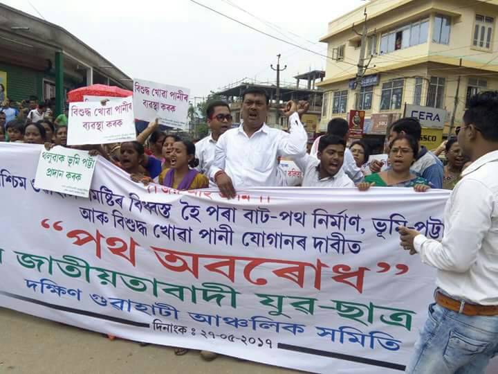 পাঞ্জাবাৰীঃ কেন্দ্ৰীয় আৰু ৰাজ্য চৰকাৰে জাক-জমকতাৰে বৰ্ষপূৰ্তি অনুষ্ঠান উদযাপন কৰাৰ সময়তেই আজি বিধায়ক ৰমেন্দ্ৰ নাৰায়ণ কলিতাৰ পশ্চিম গুৱাহাটী সমষ্টিৰ অন্তৰ্গত শাওকুছিত অসম জাতীয়তাবাদী যুৱ-ছাত্ৰ পৰিষদৰ দক্ষিণ গুৱাহাটী আঞ্চলিক সমিতিয়ে পথ অবৰোধ কাৰ্যসূচী ৰূপায়ন কৰে।