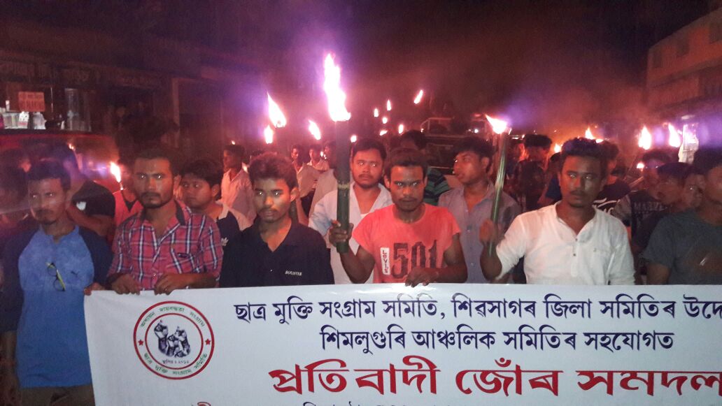 শিমলুগুৰিঃ আৰ আছ এছৰ বিৰুদ্ধে ৰাজপথত ছাত্ৰ মুক্তি সংগ্ৰাম সমিতি৷ সংগঠনটোৰ নেতৃত্বত হাতে হাতে জোৰ লৈ ৰাজ পথলৈ ওলাই আহে কেইবাশতাধিক লোক। শিক্ষানুষ্ঠানসমূহক আৰ আছ এছৰ প্ৰভাৱৰ পৰা মুক্ত কৰা,শিক্ষানুষ্ঠান সমূহত অস্ত্ৰ প্ৰশিক্ষণ বন্ধ কৰাৰ দাবীত এইসকললোকে প্ৰতিবাদ সাব্যস্ত কৰে শিৱসাগৰৰ শিমলুগুৰিত৷