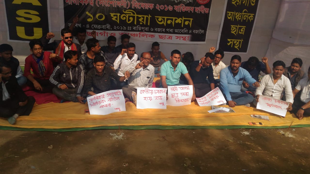ছয়গাঁওঃ সদৌ অসম ছাত্ৰ সন্থা আৰু ৩০ টাকৈ জনগোষ্ঠীয় সংগঠনৰ আহ্বান মৰ্মে নাগৰিকত্ব সংশোধনী বিধেয়ক-২০১৬ বাতিলৰ দাবীত ছয়গাঁৱত সোমবাৰৰপৰা ১০ ঘন্টীয়া অনশন কাৰ্যসূচী ৰূপায়ন কৰা হয়৷