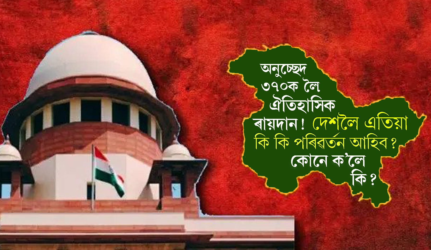 অৱশেষত ছীল-মোহৰ পৰিল জম্মু-কাশ্মীৰৰ বিশেষ ৰাজ্যৰ মৰ্যাদা বাতিলৰ কেন্দ্ৰীয় চৰকাৰৰ সিদ্ধান্তত। দেশৰ উচ্চতম ন্যায়ালয়ৰ মুখ্য ন্যায়াধীশ ন্যায়াধীশ ডি ৱাই চন্দ্ৰচূড়ৰ নেতৃত্বত গঠিত পাঁচজনীয়া বিচাৰপীঠে সৰ্বসন্মতিক্ৰমে সমৰ্থন জনায় জম্মু-কাশ্মীৰৰ বিশেষ মৰ্যাদা বিলুপ্ত কৰাৰ সিদ্ধান্তক। লগতে উচ্চতম ন্যায়ালয়ে কয় যে অহা বছৰৰ ৩০ ছেপ্টেম্বৰৰ ভিতৰত জম্মু-কাশ্মীৰত নিৰ্বাচন অনুষ্ঠিত কৰাৰ পদক্ষেপ লোৱা উচিত। শীর্ষ ন্যায়ালয়ে কয় যে জম্মু-কাশ্মীৰক অতি সোনকালে পূৰ্ণ ৰাজ্যৰ মৰ্যাদা ঘূৰাই দিব লাগে।