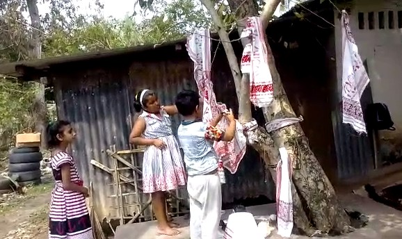 তেজপুৰ, অপুৰ্ব বৰাঃ মানৱ জীৱনৰ লগত গছৰ সম্পৰ্ক অপাৰ। কৃষিজীৱী ৰাইজৰ অপোন ৰঙালী বিহুৰ বতৰত গছক লৈ ব্যস্ত তেজপুৰৰ একাংশ মহিলা।