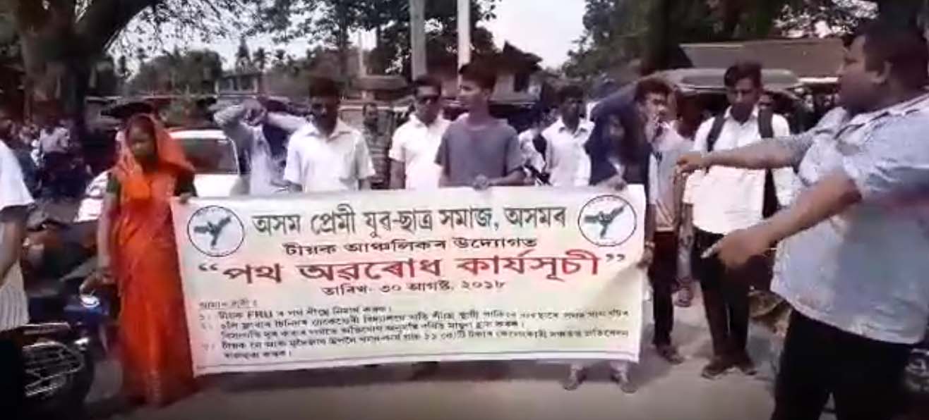 টীয়কত পথ মেৰামতিৰ দাবীত অসম প্ৰেমী যুৱ ছাত্ৰ সমাজৰ পথ অৱৰোধ