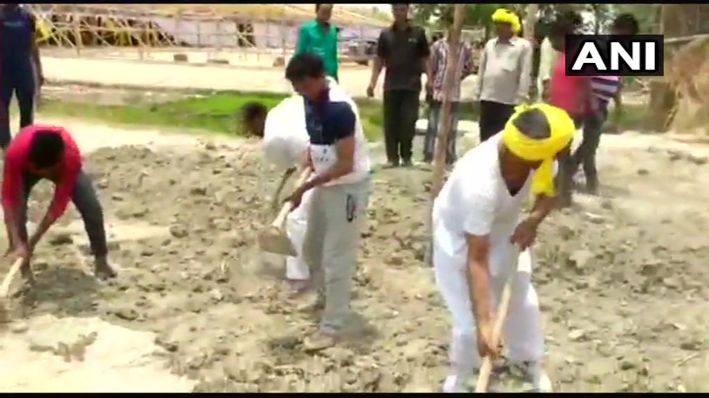 Varanasi: UP Min OP Rajbhar started repairing road that led to his home in Pindra's Phatehpur Katauna, said, 'had requested for mending of the road 2.5 months ago, but found it in the same condition on the day of my son's wedding. So I picked up spade & ppl from society followed' pic.twitter.com/yK0clQ7oUs