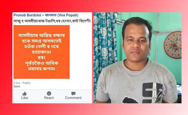 ব্যাপক গণহত্যা সংঘটিত কৰাৰ ভাবুকি প্ৰদান কৰি নিজৰ টাইমলাইনৰ লগতে গ্ৰুপটোত আপলোড কৰা উক্ত পোষ্টটোত সাম্প্ৰদায়িক মন্তব্য দিছিল গোলাঘাট জিলাৰ দেৰগাঁও থানাৰ অন্তৰ্গত দাধৰা গাঁৱৰ প্ৰণৱ বৰদলৈ নামৰ ফেচবুক ব্যৱহাৰকাৰীজনে।